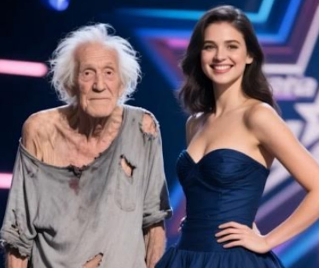 His shirt was torn, his shoes barely holding together, and his weathered hands shook slightly as he leaned on his walking stick. Standing next to him was a young, elegant dancer in a royal blue dress, her presence graceful, almost ethereal.