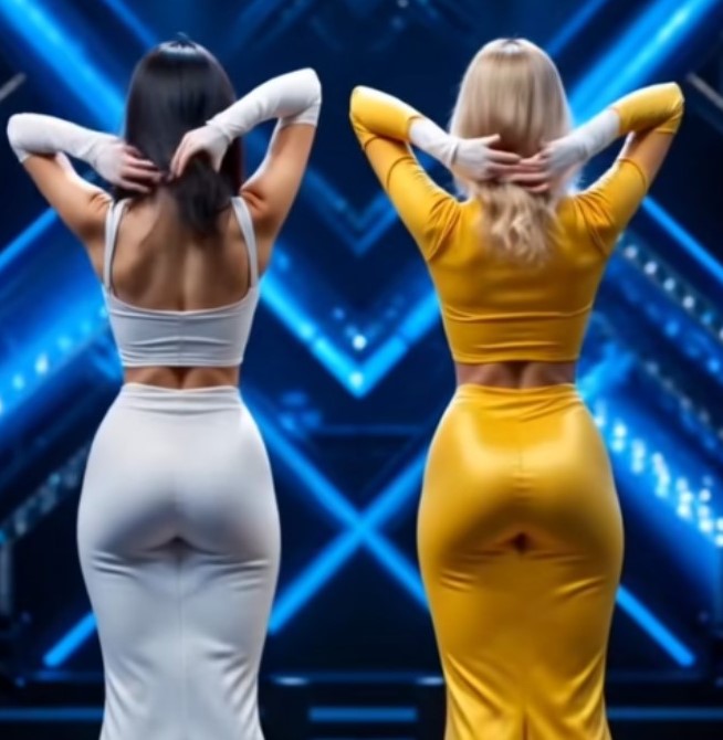 They stood side by side, their backs to the audience, motionless beneath the spotlight. Their elegant dresses clung like liquid silk, glimmering with every subtle movement. They raised their hands slowly, placing them behind their heads in perfect symmetry, and for a brief, breathless moment, the entire room seemed to pause.