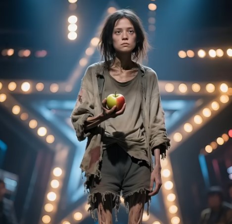 The stage lights were blinding, casting long shadows that danced across the floor. The audience murmured softly, expecting another dazzling display of talent — singers with golden voices, dancers with flawless moves, magicians with their clever tricks. But when a frail, barefoot girl walked onto the stage, holding nothing but a bruised apple in her trembling hand, the room fell silent.