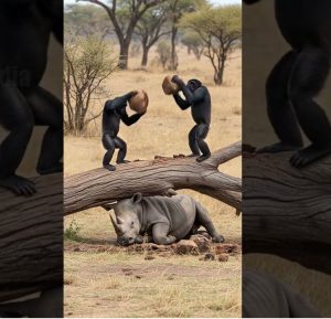 A troop of chimpanzees, known for their intelligence and teamwork, approached the scene. At first, they observed cautiously. Then, almost as if understanding the rhino’s distress, they began working together: