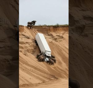 A herd of elephants, known for their intelligence and empathy, approached the stranded truck. Witnesses describe how the elephants gathered around the vehicle, trumpeting as if sensing the driver’s distress.